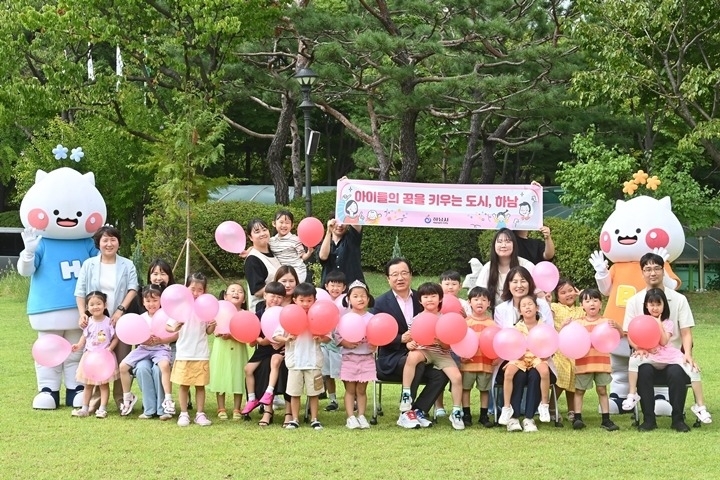 사진설명: 이현재 하남시장이 하남시청 잔디광장에서 직장어린이집 아이들, 학부모 직원들과 함께 화목한 분위기 속에 기념사진을 찍고 있다.
