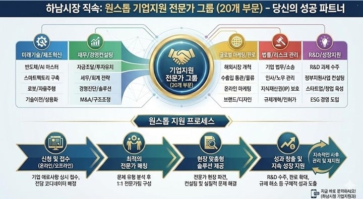 가장 눈에 띄는 것은 시장 직속으로 편제되는 20개 부문의 원스톱 기업지원 전문가 그룹이다. 반도체·AI 마스터를 비롯해 세무, 법률, 특허, 글로벌 마케팅 등 전방위 전문가가 배치된다. 이들은 중소기업이 가장 어려워하는 국비 과제 수주 전 과정을 전담하는 ‘R&D 타격대’ 임무를 수행하며, 시장의 권한으로 기업 성장을 가로막는 행정 대못을 즉시 제거하는 규제 제로 환경을 조성한다.