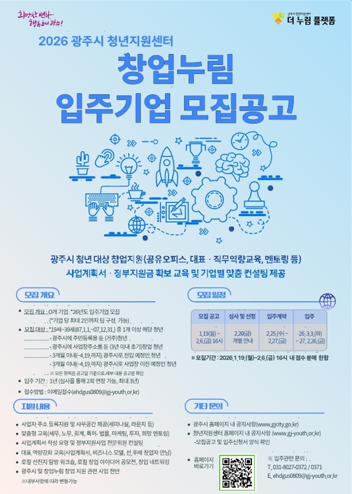 [굿타임즈24/광주시] 하홍모 기자 =광주시는 지역 내 유망한 청년 창업가를 발굴하고 안정적인 창업 환경을 조성하기 위해 ‘2026년도 창업누림 신규 입주기업’을 공개 모집한다고 19일 밝혔다.