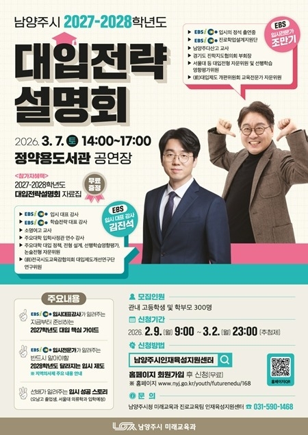 남양주시는 오는 3월 7일 정약용도서관 공연장에서 관내 고등학생과 학부모를 대상으로 ‘남양주시 2027~2028학년도 대입전략설명회’를 열고, 이에 앞서 2월 9일부터 참가 신청 접수를 진행한다.