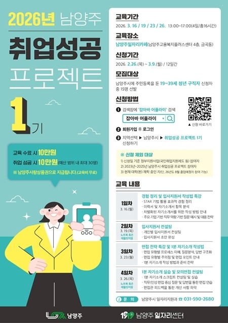 남양주시는 오는 26일부터 청년 구직자의 취업 경잭력 강화를 위해 ‘2026 취업성공 프로젝트 1기’참여자를 모집한다고 밝혔다.