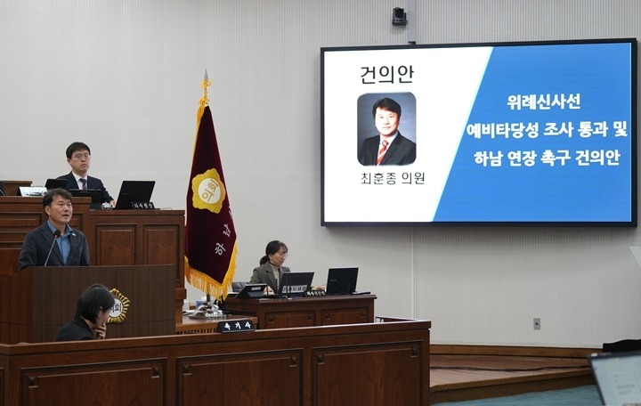 [굿타임즈24/하남] 하홍모 기자 = 하남시의회 최훈종 도시건설위원장(더불어민주당, 나선거구)은 3일 열린 하남시의회 제345회 임시회 제1차 본회의에서 ‘위례신사선 예비타당성조사 통과 및 하남 연장 촉구 건의안’을 대표 발의하여 만장일치 채택을 이끌어냈다.