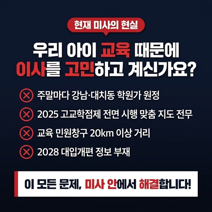 • 미사 전용 입시 데이터 뱅크 구축: 관내 고교별 내신 경향과 상위권 대학 진학 데이터를 동향 및 결과 기반 분석한 ‘미사 입시 가이드’를 매년 발간하여 정보 격차를 완전히 해소하도록 추진하겠습니다.