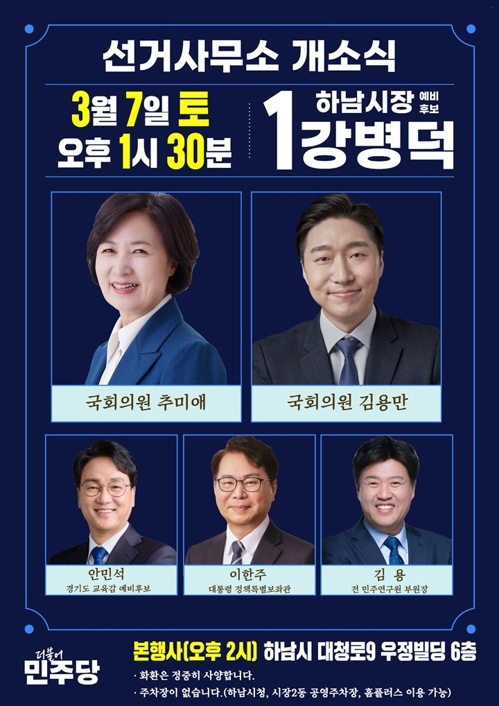 강병덕 예비후보는 오는 3월 7일(토) 오후 1시 30분(본행사 오후 2시), 하남시청 맞은편 우정빌딩 6층에서 선거사무소 개소식을 개최한다고 밝혔다. 이날 행사에는 더불어민주당 하남 갑 국회의원으로 경기도지사 선거를 준비하고 있는 추미애 국회의원과 하남 을의 김용만 국회의원이 참석해 축사를 할 예정이다.