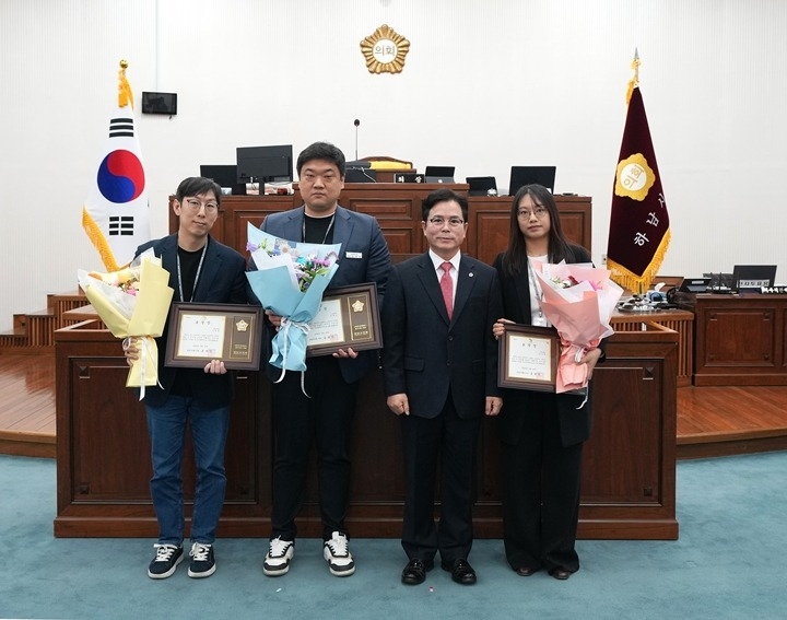 사진설명-금광연 하남시의회 의장이 지난 3월 16일 제346회 임시회 제1차 본회의에서 ‘2026년 1분기 우수공무원’ 3명을 표창하고 기념사진을 찍고 있다.