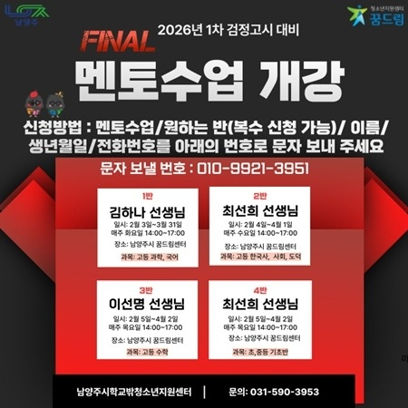 남양주시는 오는 23일부터 남양주시학교밖청소년지원센터에서 학업을 중단한 청소년을 대상으로 ‘2026년도 제1회 검정고시 대비 학습 멘토링 프로그램을 운영한다고 밝혔다.