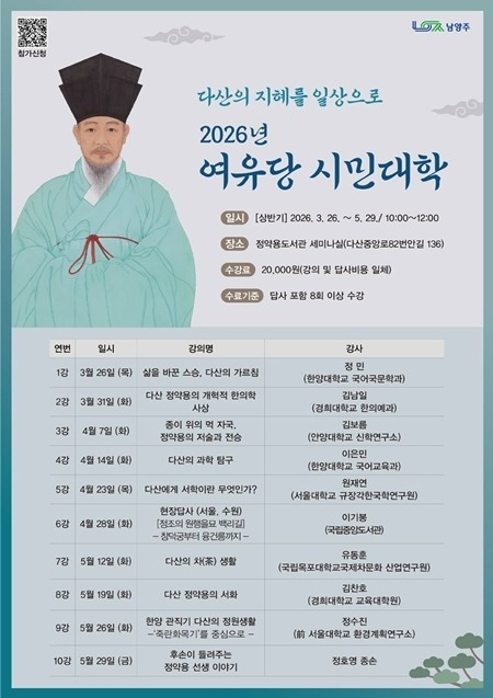 남양주시는 오는 26일부터 5월 29일까지 정약용도서관에서 다산 정약용 선생의 삶과 사상을 시민의 눈높이에서 살펴보는‘2026 여유당 시민대학’에 참여할 수강생을 모집한다고 3일 밝혔다.
