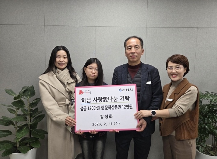[굿타임즈24/하남] 하홍모 기자 = 하남시는 지난 11일, 강성화 씨 가족이 지역 내 취약계층 아동 및 청소년을 돕기 위해 ‘하남 사랑愛나눔’ 성금으로 120만원 및 문화상품권 12만원을 하남시에 기탁했다고 밝혔다.